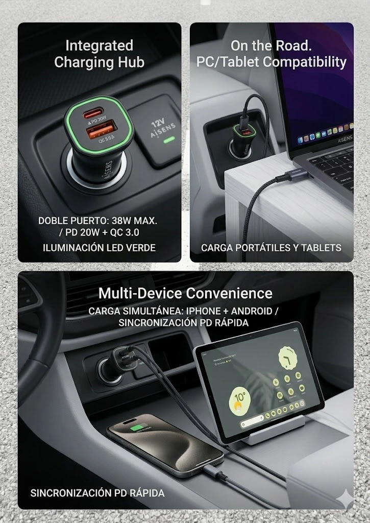 Este cargador coche aisens 38w usb-c usb-a es compatible con una amplia gama de protocolos de carga rápida, incluyendo Samsung AFC, Huawei FCP/SCP y Apple 2.4A. Esto lo hace ideal no solo para teléfonos, sino también para tablets, GPS o consolas portátiles como la Nintendo Switch. Su rango de entrada de 12-24V lo hace apto tanto para turismos como para camiones o caravanas.